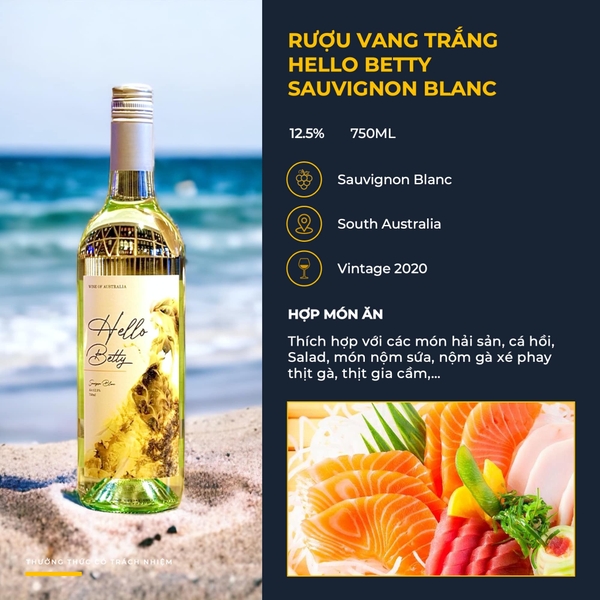 Sauvignon Blanc thể hiện hương vị đáng yêu của chanh và bưởi, cũng như hương thơm dịu nhẹ của chanh dây và đào trắng. Rượu vang trắng Úc Hello Betty có màu vàng nhạt và sảng khoái với vị chua nồng nàn và hậu vị giòn, khô, tạo nên sự kết hợp tuyệt vời với Hải sản, ngon hơn khi ướp lạnh.
